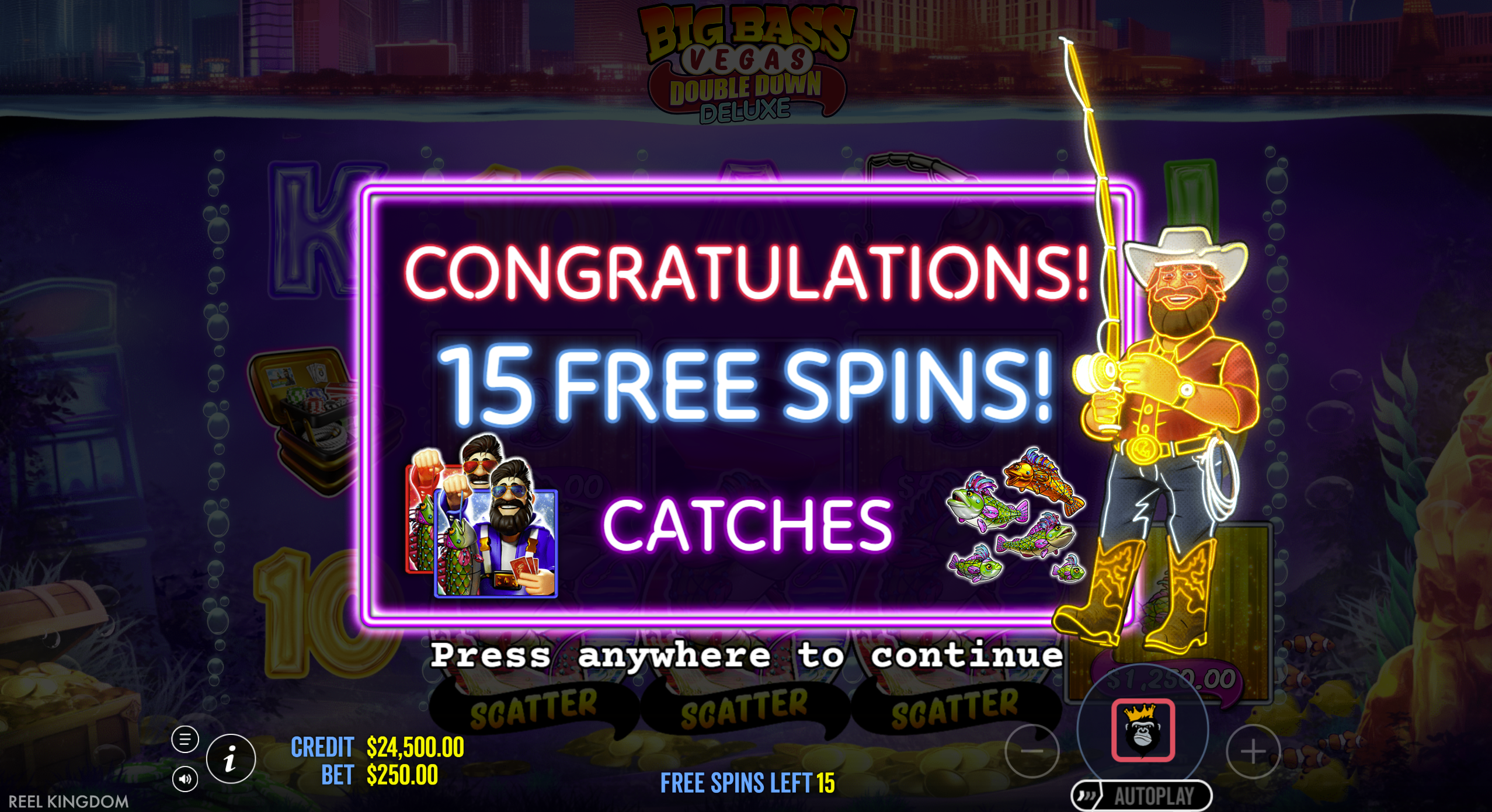 - Sticky Fisherman: Fisherman Wild stays on reel 5 throughout free spins for auto collections.